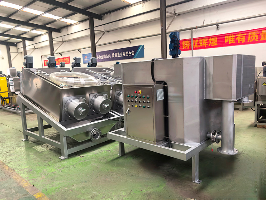 固定環(huán)和游動環(huán)之間形成的濾縫以及螺旋軸的螺距從濃縮部到脫水部逐漸變小。螺旋軸的旋轉(zhuǎn)在推動污泥從濃縮部輸送到脫水部的同時,也不斷帶動游動環(huán)清掃濾縫,防止堵塞。